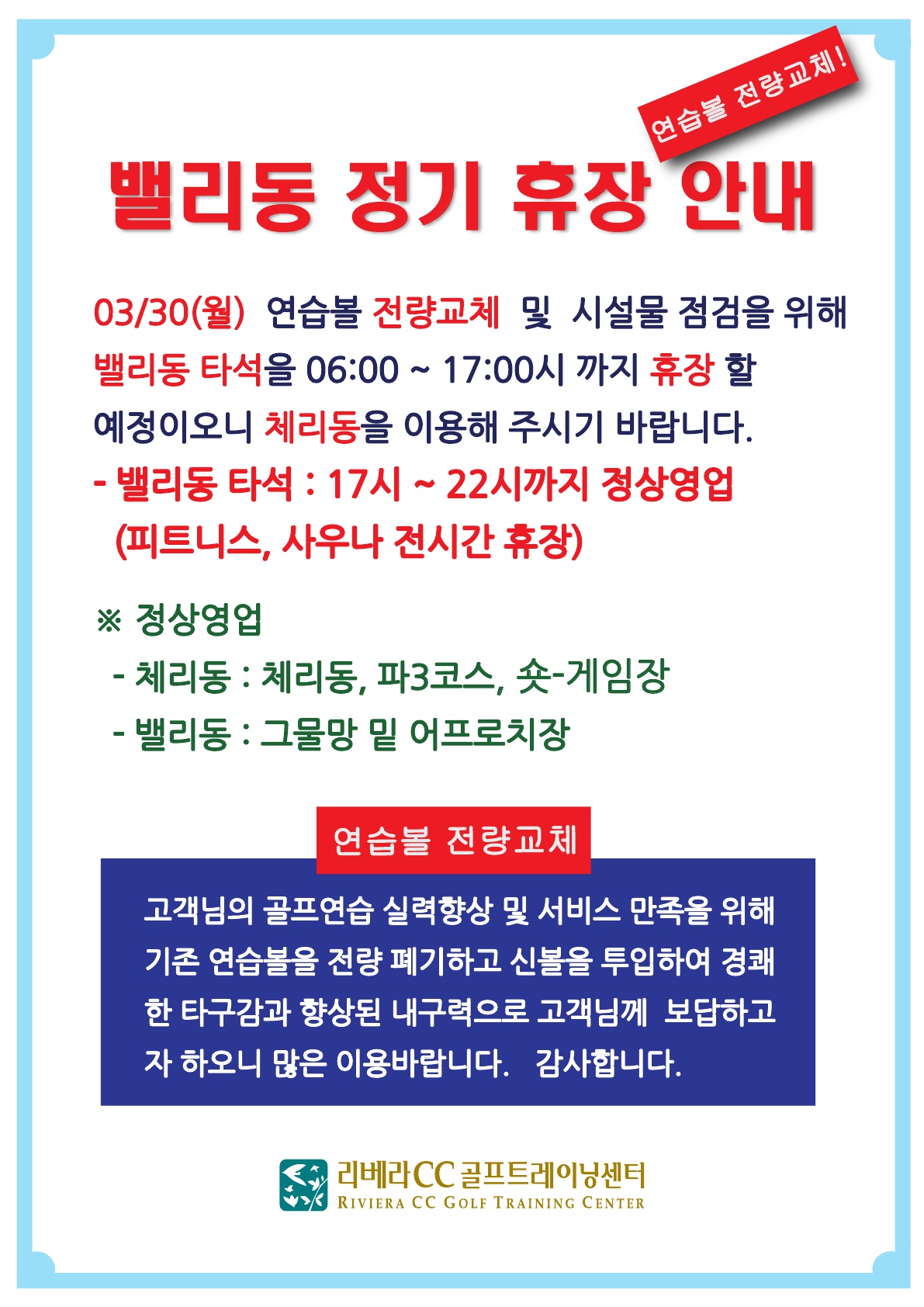 밸리동 정기휴장 안내 (연습볼 전량교체)